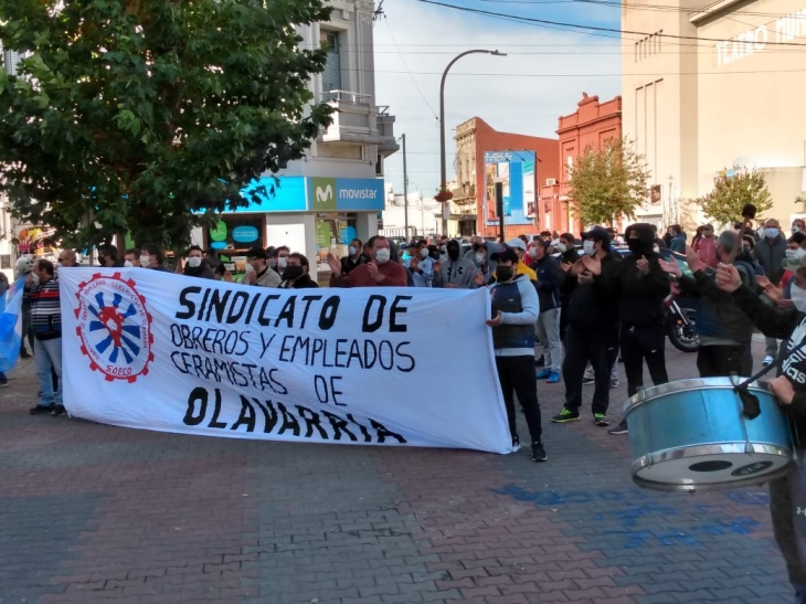 Tras la audiencia virtual realizada con los dueños de Cerro Negro y Losa y el el titular de la Delegación local del Ministerio de Trabajo, Lucas Miriuka, el secretario general de Soeco, Pedro Garay, y el abogado Juan Sánchez, hablaron con los más de 100 trabajadores ceramistas que se concentraron esta mañana a la espera de novedades respecto al pago de sus salarios.