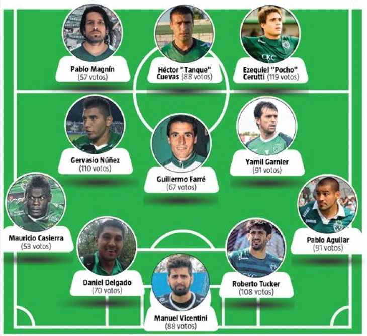 El arquero elegido es Manuel Vicentini con 88 votos; y la línea defensa quedó conformada por Pablo Aguilar (91), Roberto Tucker (108), Daniel Delgado (70) y Mauricio Casierra (53); en el medio, Yamil Garnier (91), Guillermo Farré (67) y Gervasio Núñez (110); mientras que los delanteros más votados fueron Ezequiel "Pocho" Cerutti (119), Héctor "Tanque" Cuevas (88) y Pablo Magnín (57).
