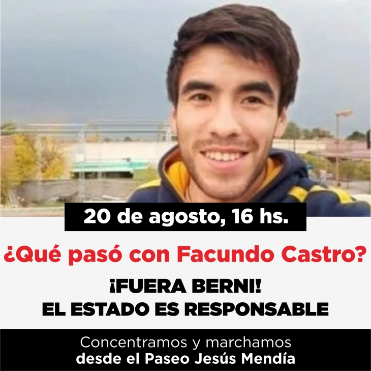 En el marco de la desaparición del joven bahiense Facundo Astudillo Castro, organizaciones sociales y políticas convocan a una concentración este jueves a las 16 en el Paseo Jesús Mendía.