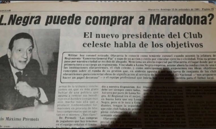 Los medios locales se hicieron eco de la sorprendente noticia, confirmada en ese momento por quien era el presidente del club, el militar retirado Luis Prémoli.