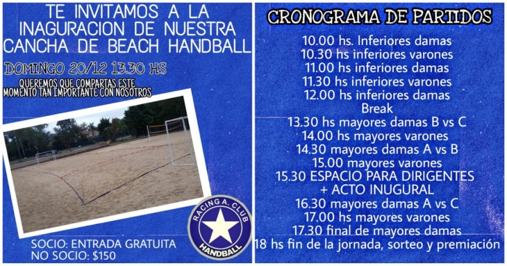 El sueño del handball de Racing se hizo realidad, este domingo será inaugurada la ansiada cancha de arena. La misma se ubica en el sector de los piletones.