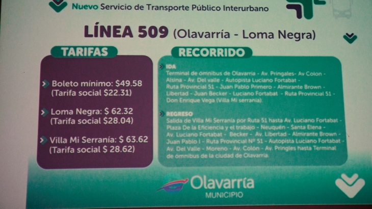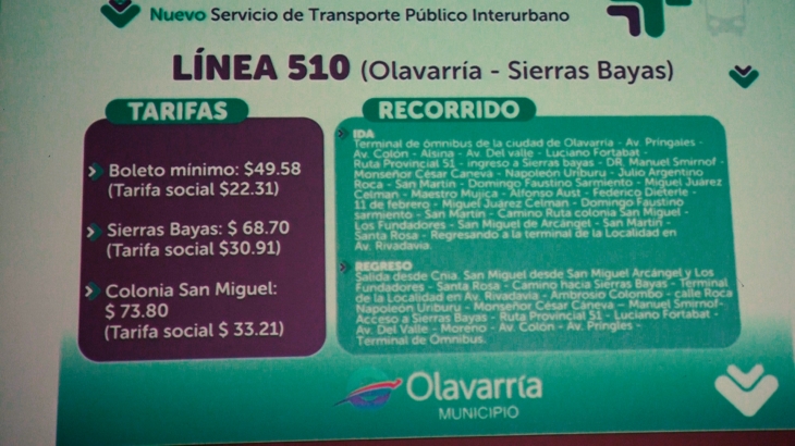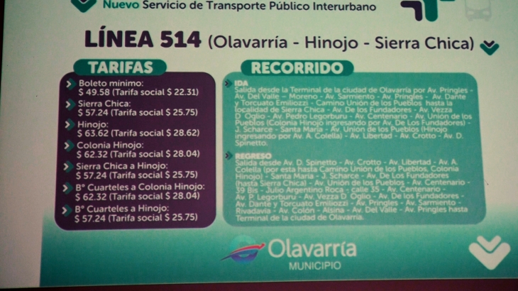 Sierra Chica a Hinojo: $ 57.24 (Tarifa social $ 25.75)