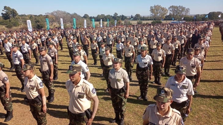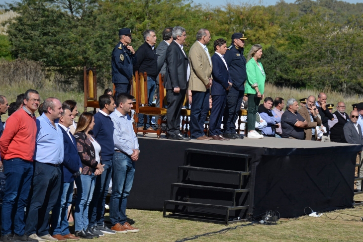 Kicillof llegó para presenciar, junto al ministro de Seguridad Sergio Berni, el egreso de la primera camada de casi mil oficiales de la especialidad rural de la Policía de la Provincia (Olavarría, Bahía Blanca, La Costa y Ramallo). Es por eso que el acto se llevó a cabo en la Escuela “Juan Vucetich” ubicada en el cerro Fortabat de Loma Negra. Los acompañó la ministra de Gobierno, Cristina Álvarez Rodríguez, y también estuvo en el escenario principal el comisario general Daniel Alberto García, máximo referente de la Policía Bonaerense. Se pudo ver además a intendentes y funcionarios bonaerenses.