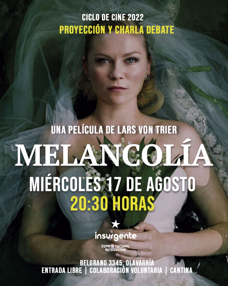 En el marco del ciclo de cine 2022 del espacio cultural "Insurgente", este miércoles 17 de agosto desde las 20:30 se proyectará la película "Melancolía".