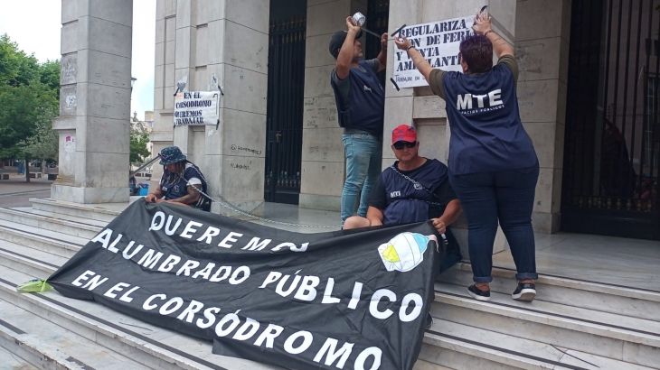 A su vez, el reclamo por la falta de agua coincidió con el que llevó a cabo el Movimiento de Trabajadores Excluidos (MTE), que frente al Palacio San Martín volvió a pedir que le habiliten el alumbrado público para poder realizar hasta la noche sus ferias de economía popular. Dos personas se encadenaron al edificio.