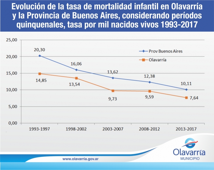 En el informe se observa una notable reducción porcentual en Olavarría y la Provincia de Buenos Aires, considerando como base el período 1993-1997. En nuestro Partido, tal como se precisa en el informe, se observa una tendencia incluso por debajo de las tasas nacionales y provinciales de mortalidad infantil.