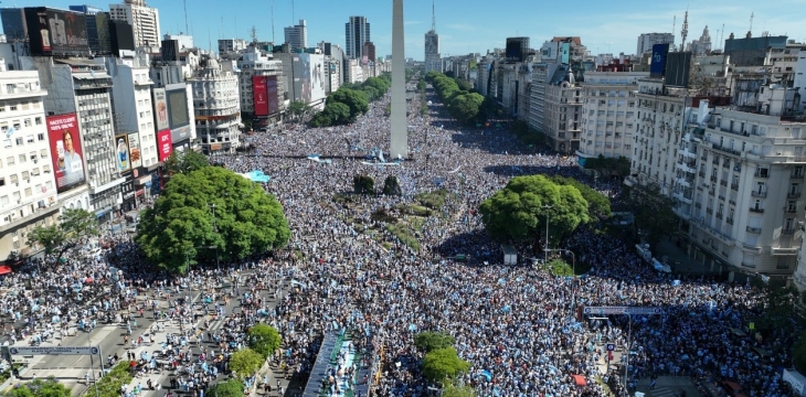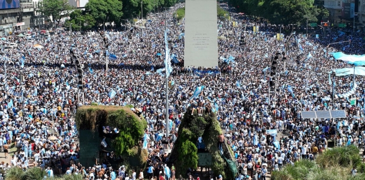 La avenida 9 de Julio de la ciudad de Buenos Aires está cubierta por una marea de gente vestida con los colores de Argentina. Llegar al sector es misión imposible. Miles de personas están ahí y van a seguir por horas. Los subtes desbordan de gente. "Es la fiesta más grande del mundo".