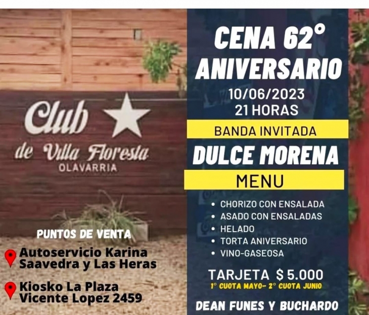El festejo se realizará el 10 de junio desde las 21 y se encuentran en venta las tarjetas en dos puntos: Mercadito Karina (Saavedra y Las Heras) y Kiosko La Plaza (Vicente López 2459) a un costo de 5.000 pesos, que se podrán abonar en dos cuotas.