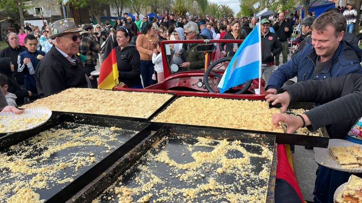 Para dar lugar a los momentos cumbre de la jornada: el corte de la torta rusa gigante, del que participó el más importante descendiente de la comunidad en la actualidad, el intendente Maximiliano Wesner, quien con sus propias manos empezó la repartija entre el púbico.