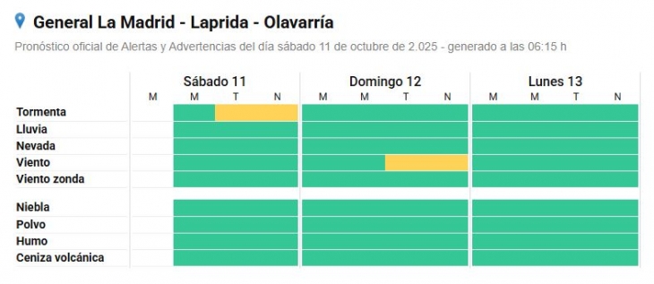 Este sábado el Servicio Metereológico Nacional (SMN) emitió dos alertas amarillas para Olavarría, para la tarde y noche de hoy.