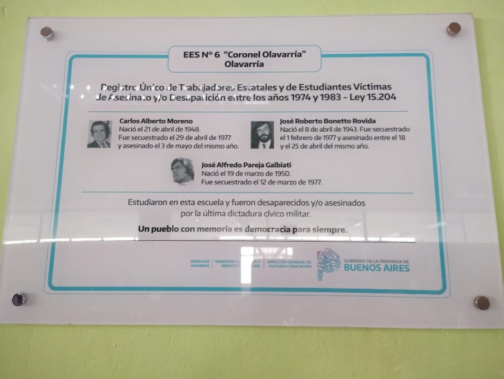 Este martes, en la sede de la Escuela de Educación Secundaria 6, se colocó una placa conmemorativa de tres estudiantes que pasaron por la institución y luego fueron detenidos desaparecidos, en el período de la dictadura militar.