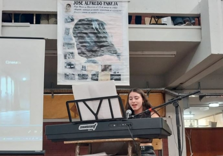En el inicio del acto habló el vicedirector de la escuela Julio Colombo, quien presentó una “perfomance” realizada por los estudiantes que participaron en Mar del Plata del programa “Jóvenes y Memoria”.