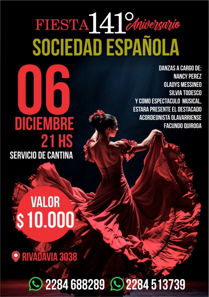 Desde la Sociedad Española de Socorros Mutuos de Olavarría invitan a disfrutar de una Fiesta Española el sábado 6 de diciembre, desde las 21 horas en la sede ubicada en Rivadavia 3038.