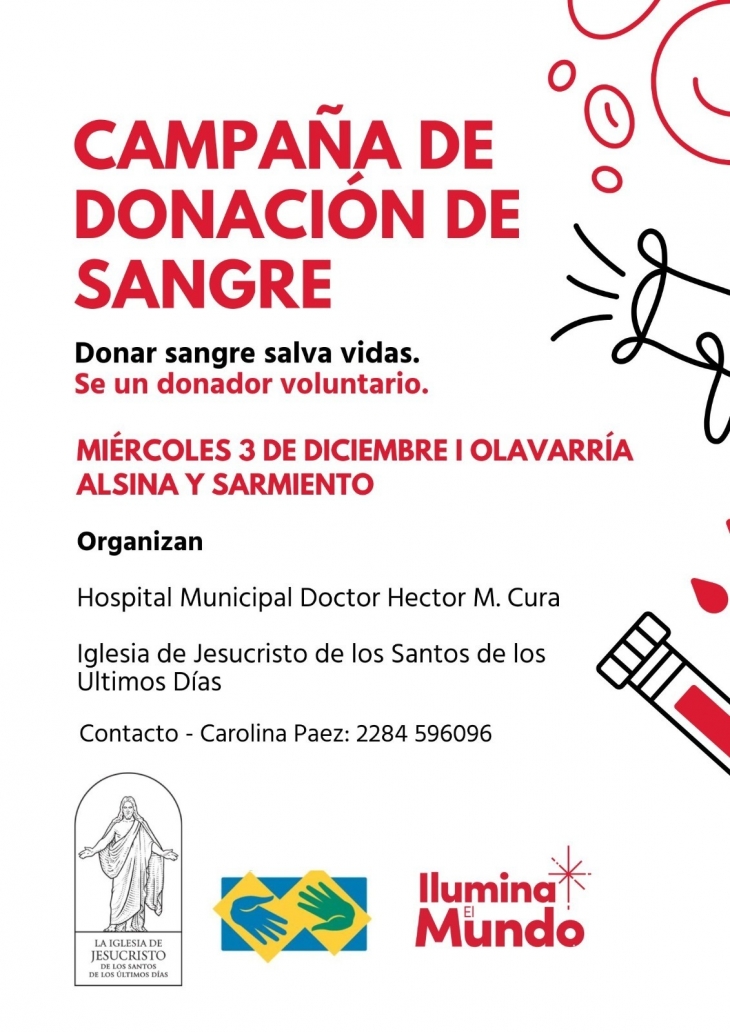 El próximo miércoles 3 de diciembre se llevará a cabo en instalaciones de la Iglesia de Jesucristo de los Santos de los Últimos Días situada en Alsina y Sarmiento una campaña de donación de sangre que organizada en forma conjunta por la iglesia y el servicio de hemoterapia del Hospital Municipal “Dr. Héctor Cura”.