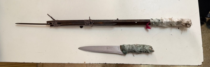 Fueron secuestrados una cuchilla de 30 cm. de largo, una varilla de metal con filo en su punta y empuñadura de nylon blanco y además el detenido dañó el botón antipánico.