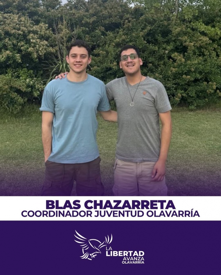 El texto dice: “Le presentamos a Blas Chazarreta, coordinador de juventud de LLA Olavarría. El objetivo es claro: apertura, compromiso y trabajo para que Olavarría sea cada día una ciudad más libre.