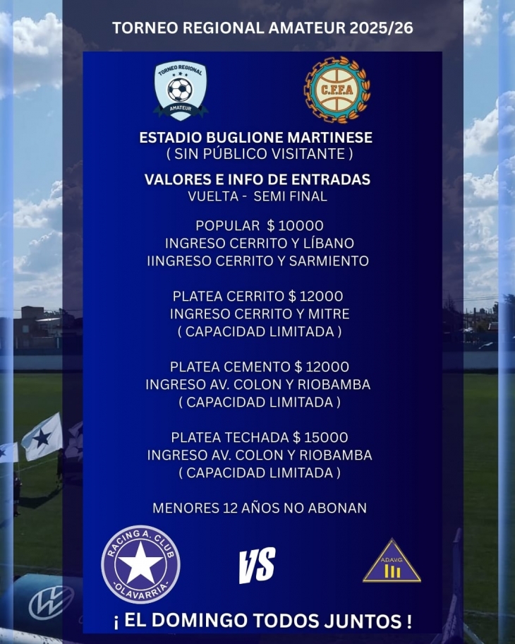 Racing espera un “Buglione Martinese” a reventar este domingo a las 20.30, cuando reciba a Atlético Villa Gesell en el partido de vuelta de una de las semifinales de la Región Bonaerense Pampeana Sur del Torneo Federal Amateur.