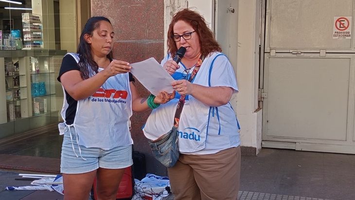 En primera instancia, hubo un discurso a cargo de Hosanna Cazola y Ludmila Adad en el que expresaron: “Nos encontramos hoy acá para hacer frente al esfuerzo por dominar y aplastar la vida de los trabajadores. Quieren aprobar esta Ley en medio de una ola de despidos, de cierre de fábricas, de empobrecimiento de la población”.
