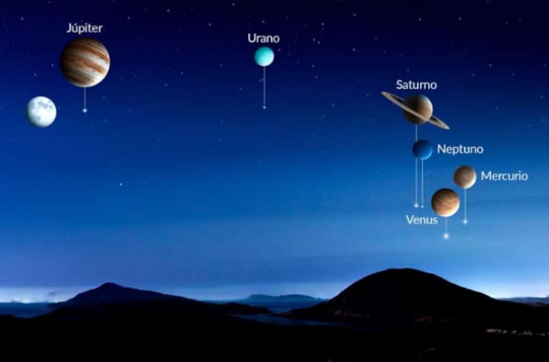Cuatro de los seis planetas tendrán suficiente brillo para distinguirse a simple vista: Venus, Júpiter, Saturno y Mercurio. Los otros dos, Urano y Neptuno, requerirán binoculares o telescopios debido a su bajo brillo.