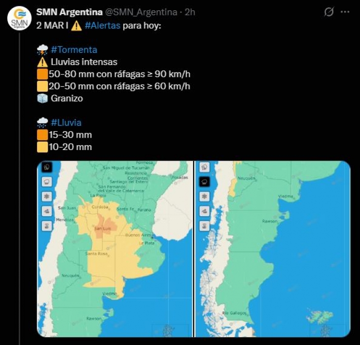 Según el SMN el área será afectada por tormentas aisladas de variada intensidad, algunas localmente fuertes. Las mismas estarán acompañadas por lluvias abundantes en cortos períodos, frecuente actividad eléctrica, ocasional caída de granizo y ráfagas que podrían alcanzar los 60 km/h. Se prevén valores de precipitación acumulada entre 30 y 50 mm, que pueden ser superados de manera puntual.