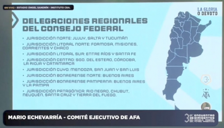 Mario Echevarría, integrantes del Comité Ejecutivo de la Asociación del Fútbol Argentino, hizo este sábado en la III Reunión de Dirigentes de Interior celebrada en el gimnasio de Instituto de Córdoba el anuncio político más importante para el funcionamiento del Consejo Federal.