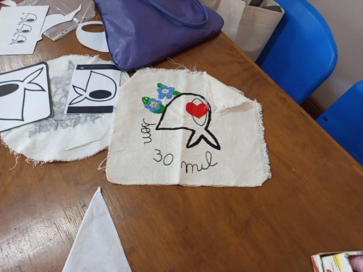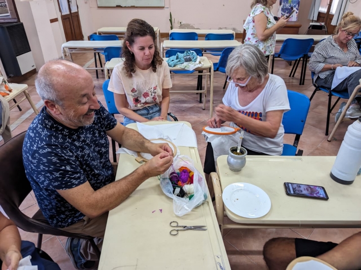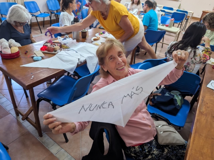La iniciativa de bordar pañuelos para exponerlos el próximo 24 de marzo. Casi una veintena de personas, entre docentes, familiares de detenidos en dictadura y otros asistentes bordaron frases, dibujos y fechas, entre las que resaltó “Nunca más”.