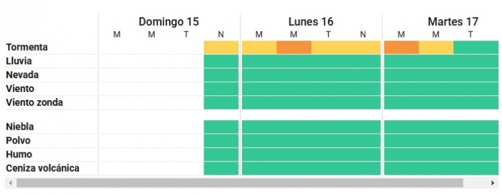 Mientras que las advertencias de color naranja, que abarcan la mañana del lunes y madrugada del martes, el SMN indicó que las ráfagas podrían alcanzar los 90 km/h y las precipitaciones se ubicaran en torno a los 50 y 80 mm, que pueden ser superados de forma puntual.