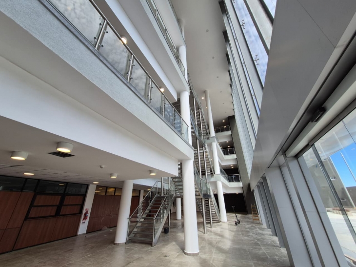 Durante la recorrida de este miércoles se pudo confirmar no sólo impactante imagen exterior -que apenas asoma desde la vereda-, un patio exterior que aguarda los últimos detalles decorativos, sino también la imponencia de un interior que cuenta con todas sus divisiones, los ascensores, las escaleras metálicas que conducen a los distintos niveles y las distintas instalaciones finalizadas.