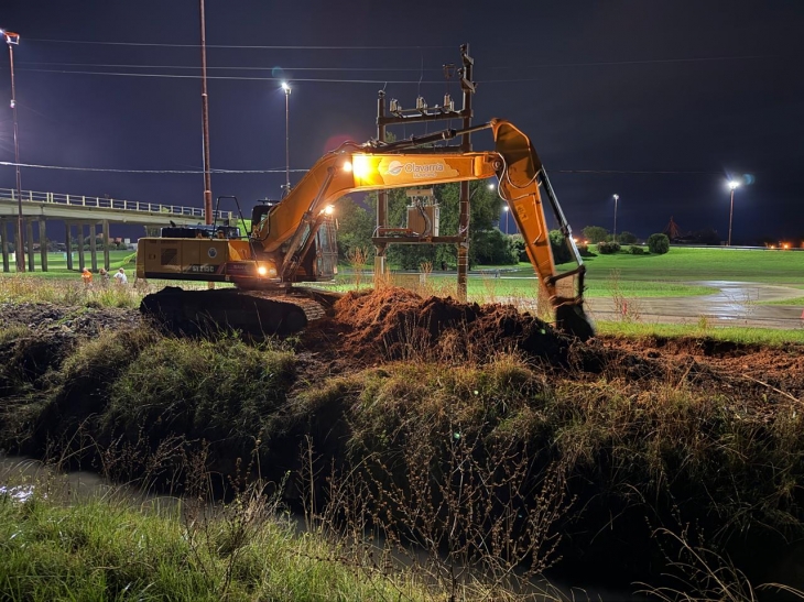 En horas de la madrugada, con la presencia del intendente Maximiliano Wesner y la coordinación del secretario de obras públicas Orfel Fariña, se realizaron en el barrio Eucaliptus nuevas tareas sobre canales aliviadores mediante la utilización de una retroexcavadora.