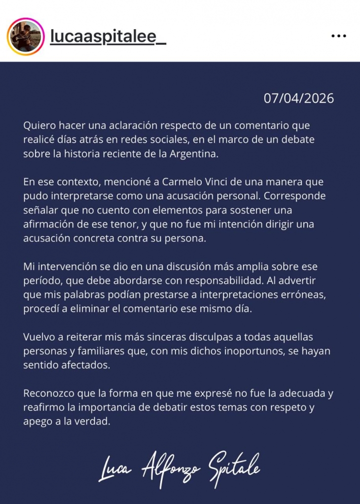 En este contexto, el joven difundió un comunicado en sus redes sociales en el cual expresó: “Quiero hacer una aclaración respecto de un comentario que realicé días atrás en redes sociales en el marco de un debate sobre la historia reciente de la Argentina”.