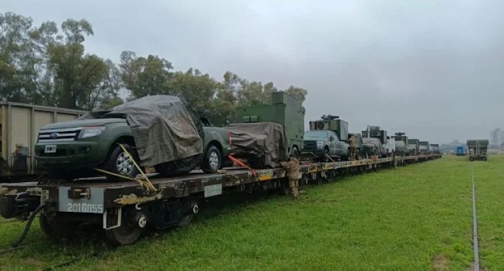 La locomotora y el personal pertenecen a Ferrosur y los vagones son de Belgrano Cargas, que transportarán vehículos de combate y de uso general.
