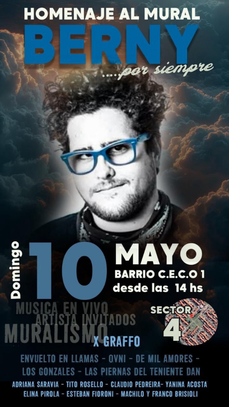 El próximo domingo 10 de mayo el Sector 4 del barrio CECO I se realizará un homenaje al mural “Berny por siempre” en recuerdo de Bernardo "Berni" Cordero, reconocido músico y productor olavarriense que falleció el pasado 31 de diciembre a los 37 años.